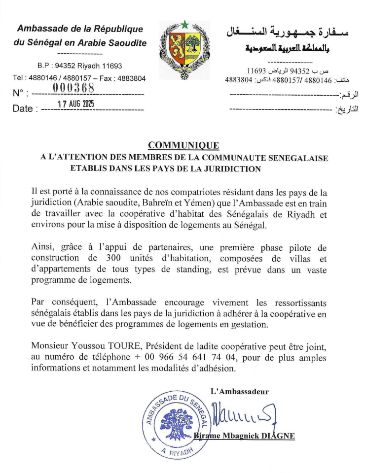 Soumettre votre demande à l’ambassade du Sénégal à Riyadh jusqu’au 2 octobre 2025.