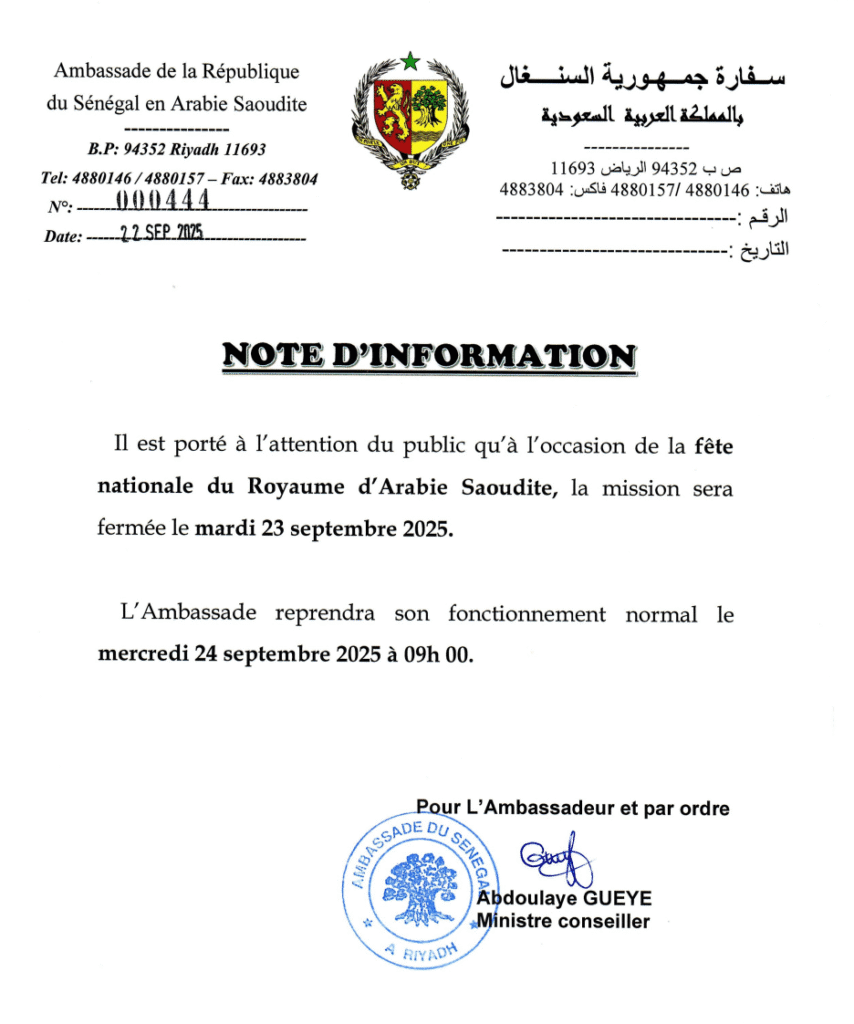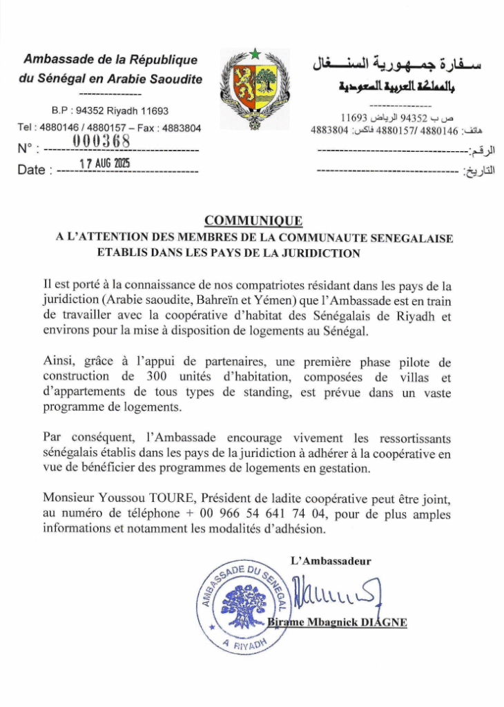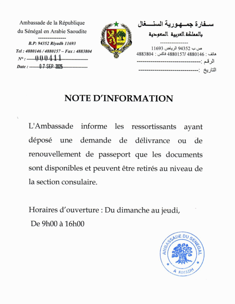 Soumettre votre demande à l’ambassade du Sénégal à Riyadh jusqu’au 2 octobre 2025.
